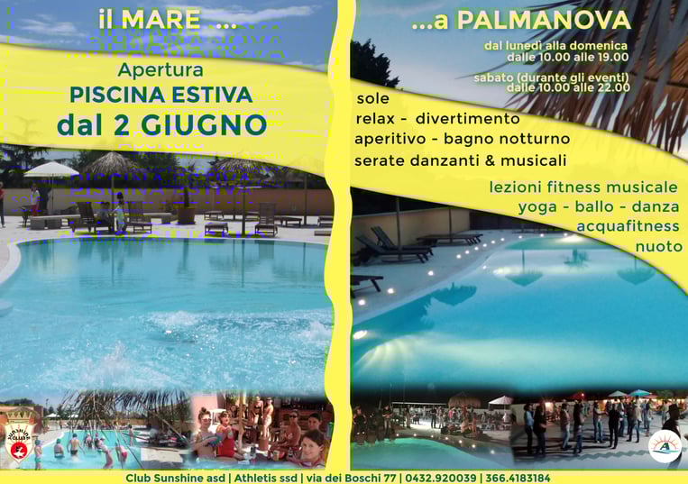 Club SUNSHINE ti offre un tuffo in piscina. Ti ospitiamo per qualche ora di vero relax, da solo od in compagnia di amici o familiari, dove potrai accomodarti su un comodo lettino godendo dell'ombra di un ombrellone. Gli ingressi sono limitati per consentire a te ed i tuoi amici o congiunti il rispetto delle reciproche esigenze, a due passi dalla Città UNESCO di Palmanova.